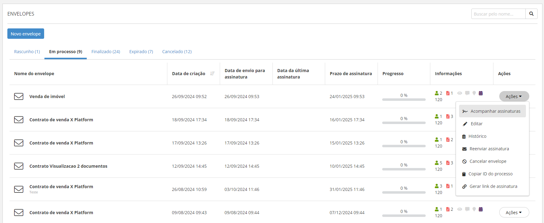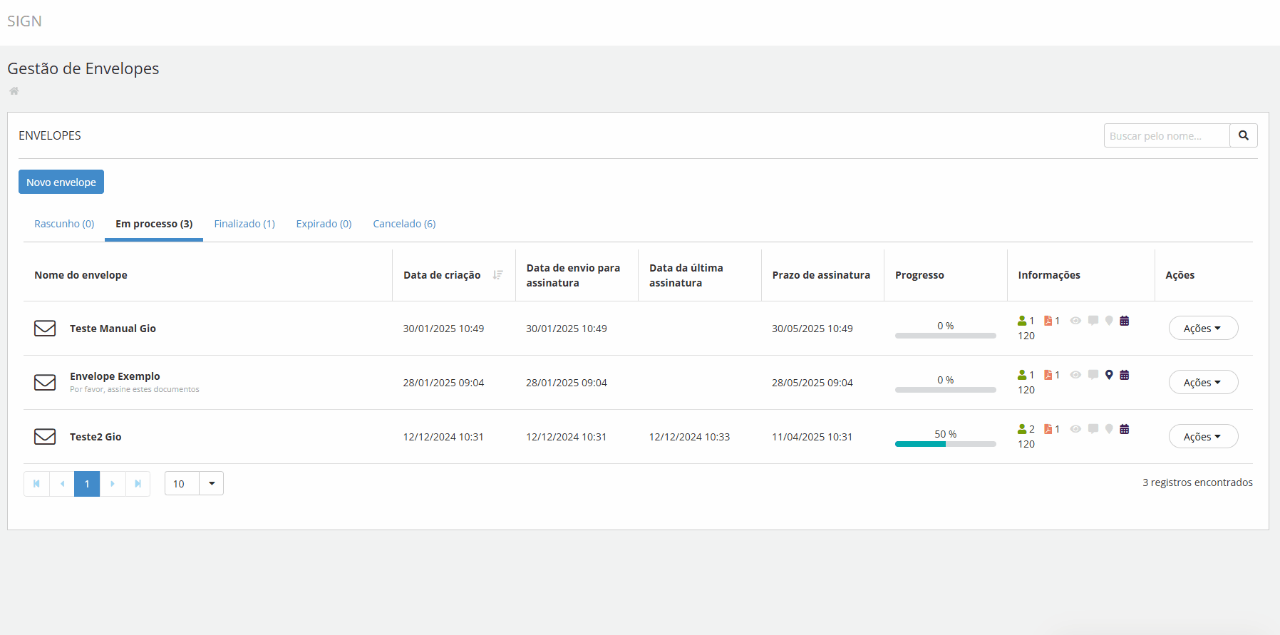 Os envelopes são exibidos de acordo com seu estado (status), conforme as opções apresentadas nas guias. Cada linha representa um envelope diferente e exibe informações relacionadas a ele, como número de signatários, quantidade de documentos, coleta de geolocalização e prazo para assinatura, entre outros.