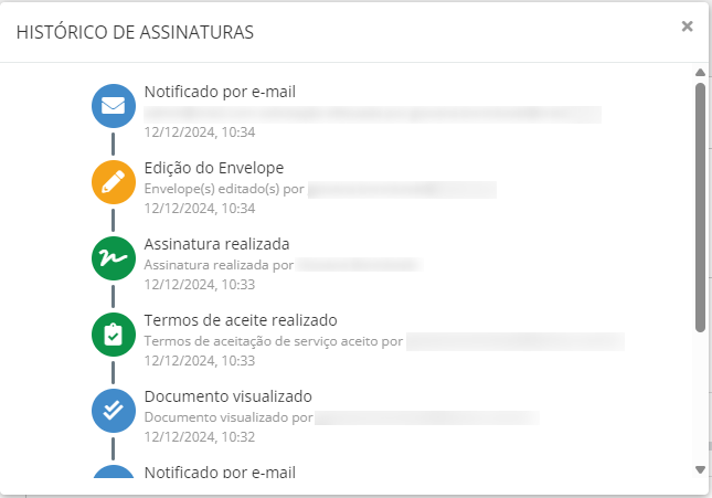 O Histórico de Assinaturas fornece uma visão cronológica dos registros de ocorrências do processo de assinatura. Esses eventos podem ser encontrados nas guias Em Processo ou Finalizado dos envelopes e estão acessíveis por meio do botão Ações, na opção Histórico. O histórico é exibido em ordem cronológica, do evento mais antigo ao mais recente.