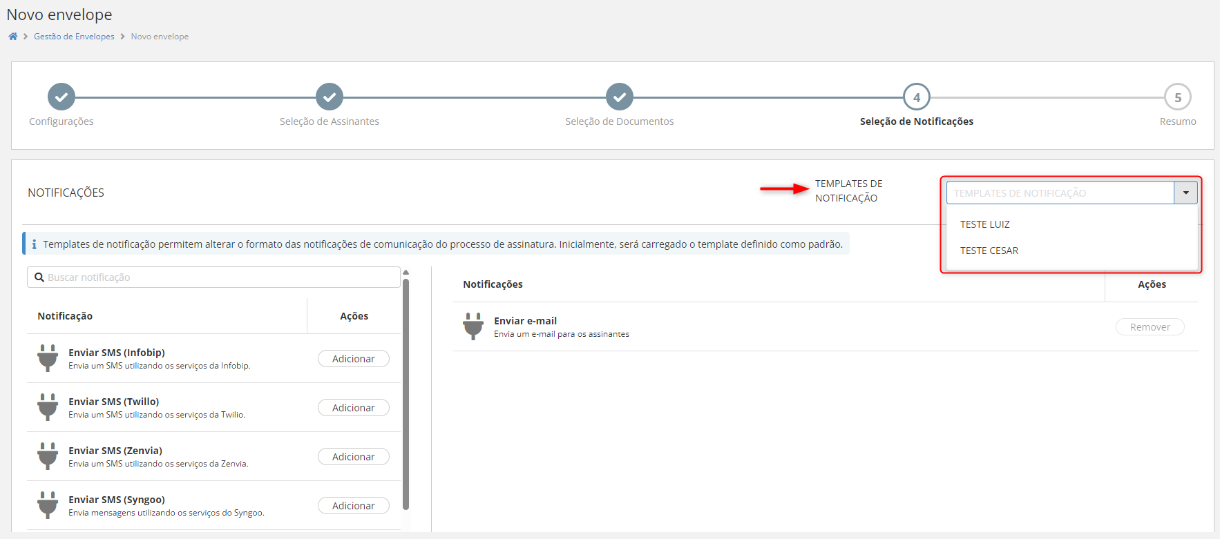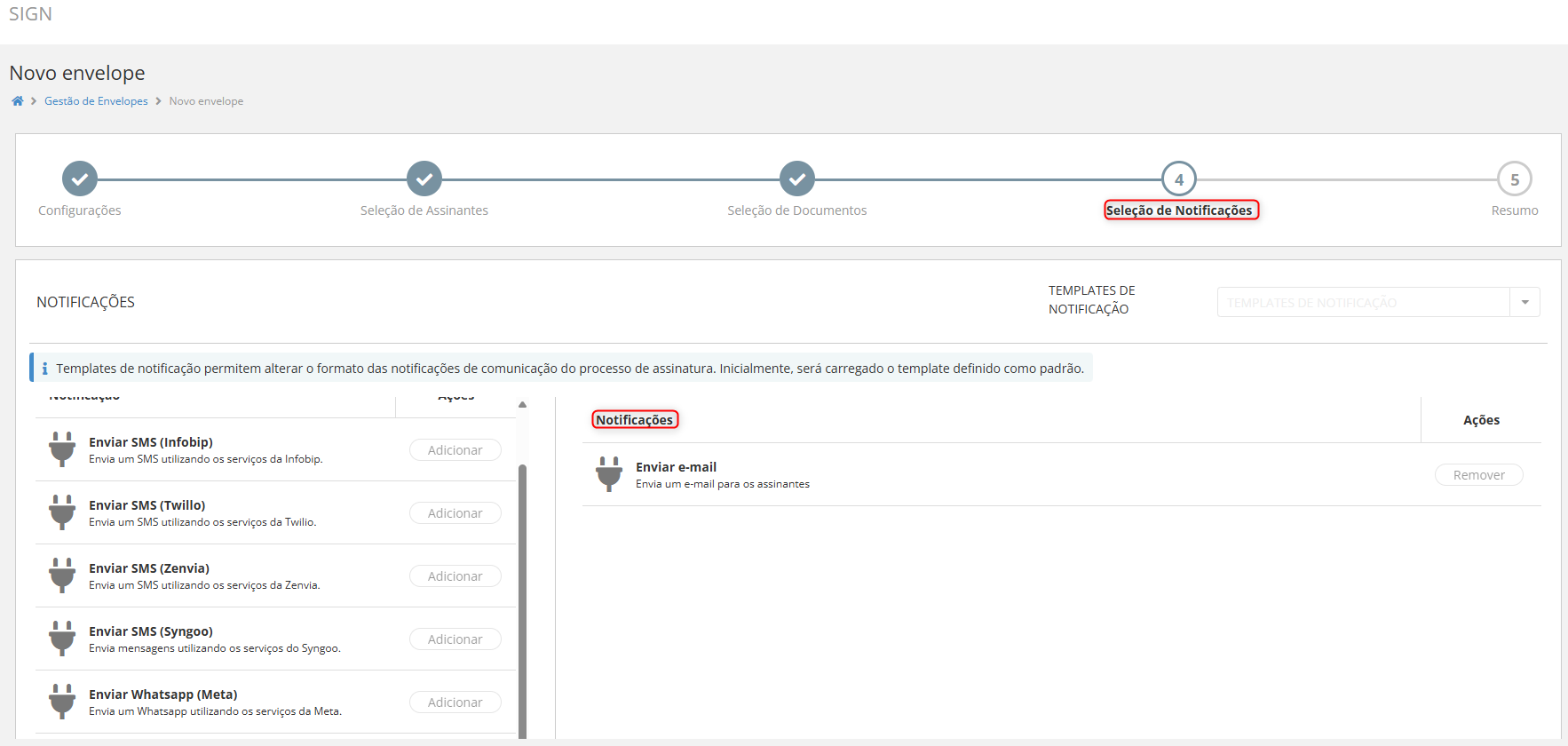 Para adicionar templates de envelopes, acesse a documentação Templates de Envelopes