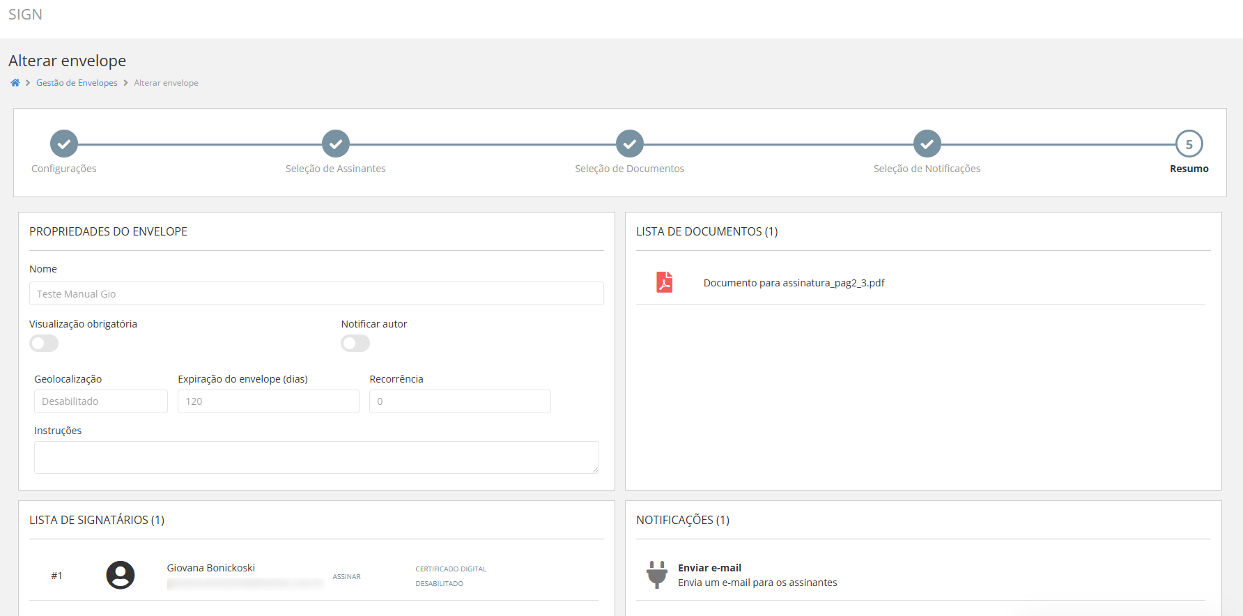 Na tela final, será apresentado um resumo com todas as informações do envelope, incluindo a lista de documentos e os signatários selecionados.