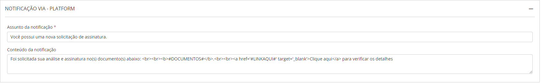Dentro das etapas de solicitação de assinatura, assinatura pendente e Finalizado, é obrigatório incluir a tag #LINKAQUI#, que direciona para o link do documento.