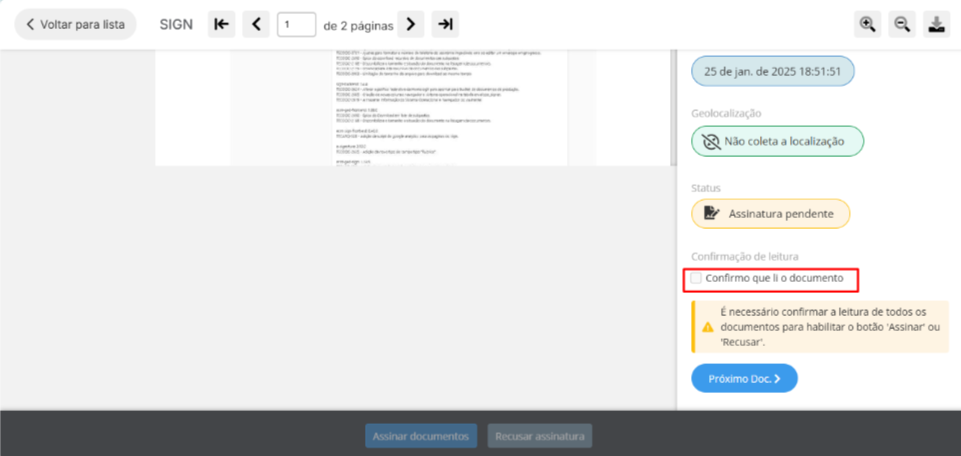 Após a marcação do checkbox, ou seja, a confirmação de leitura de todos os documentos do processo, os botões Assinar documentos e Recusar assinatura são habilitados.