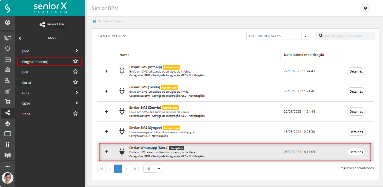 - Abra o Menu Senior Flow→ Plugin (Conector).