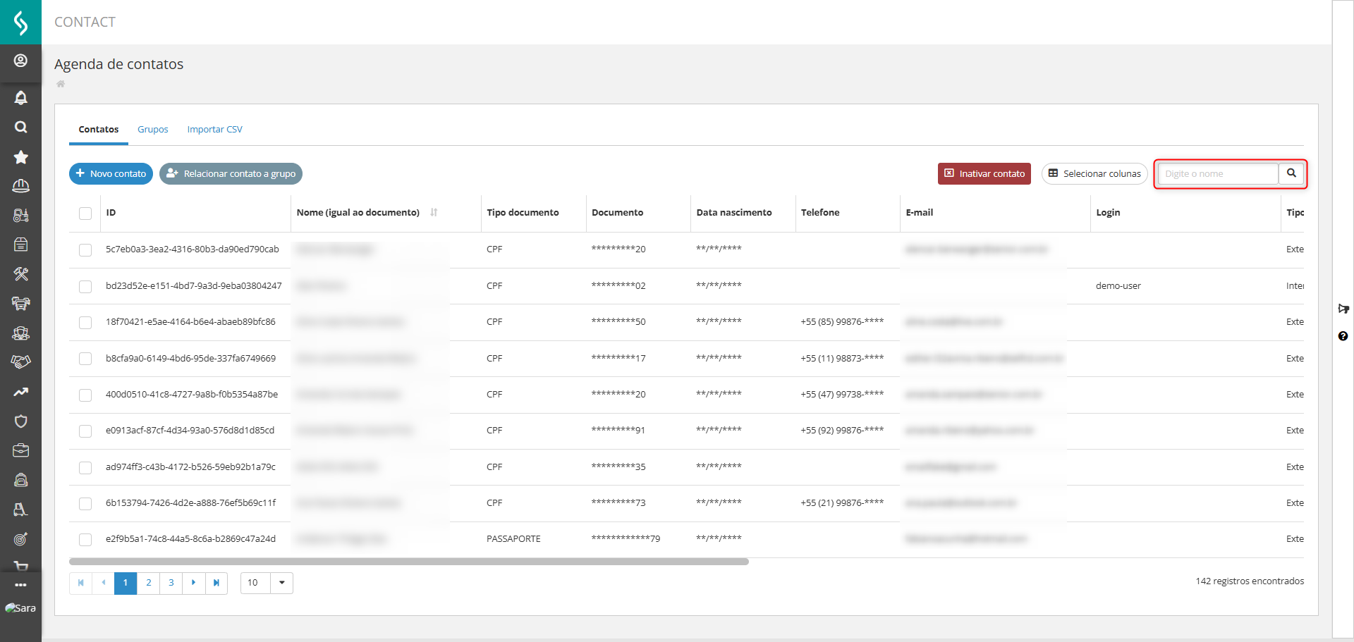Os contatos podem ser facilmente localizados utilizando o campo de Busca. Ao digitar três caracteres, o sistema começará a exibir os resultados correspondentes.