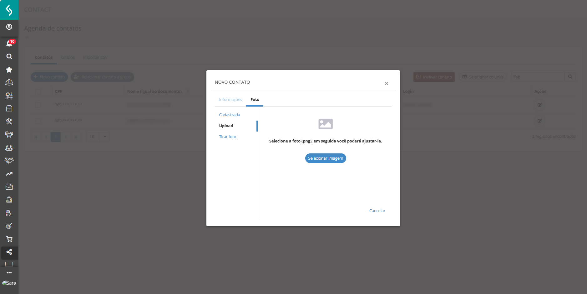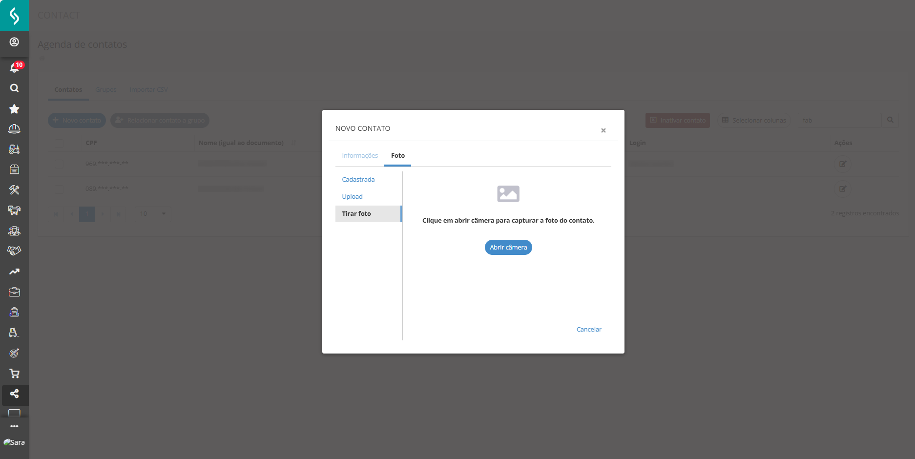 - Se não houver foto vinculada ao contato, o sistema exibirá uma mensagem informando a ausência da imagem, permitindo fazer upload ou tirar uma foto com a câmera.