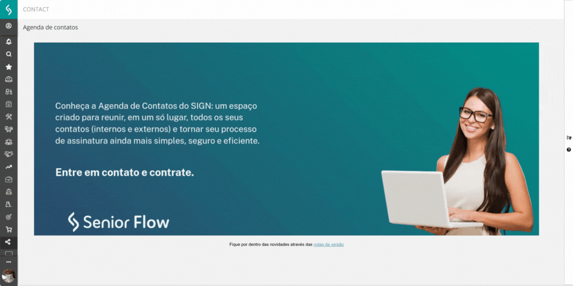 Nesta tela são exibidos todos os contatos salvos pelos usuários solicitantes de assinatura, organizados em um único local, incluindo contatos internos e externos.
