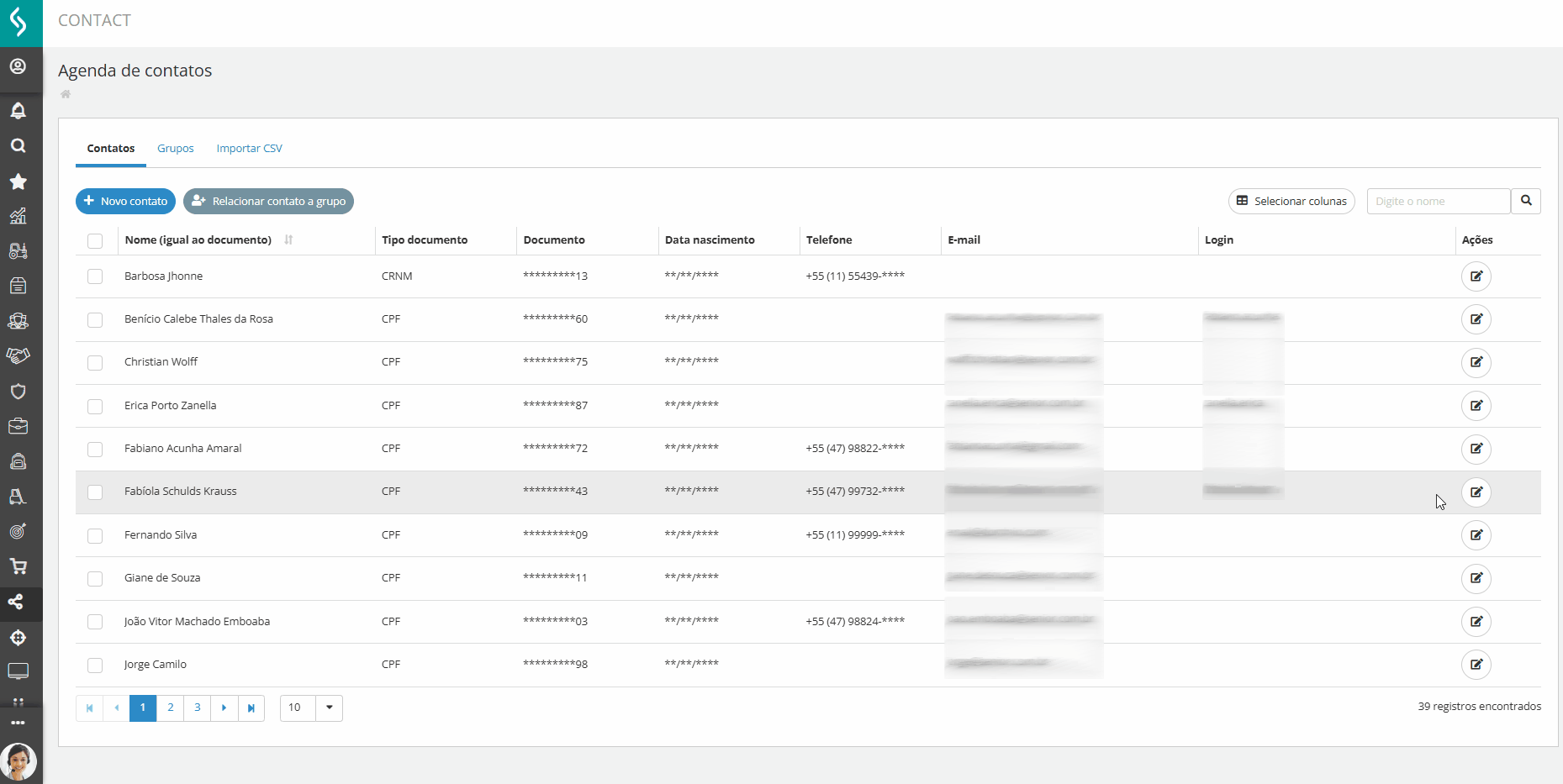 A edição de um contato pode ser realizada quando já existe um cadastro e é necessário atualizar algum dado, como os campos E-mail, Telefone, Login ou ainda o campo Grupo. Para isso, utilize a opção de edição disponível ao lado de cada registro. Apenas usuários com permissão para edição poderão alterar dados.