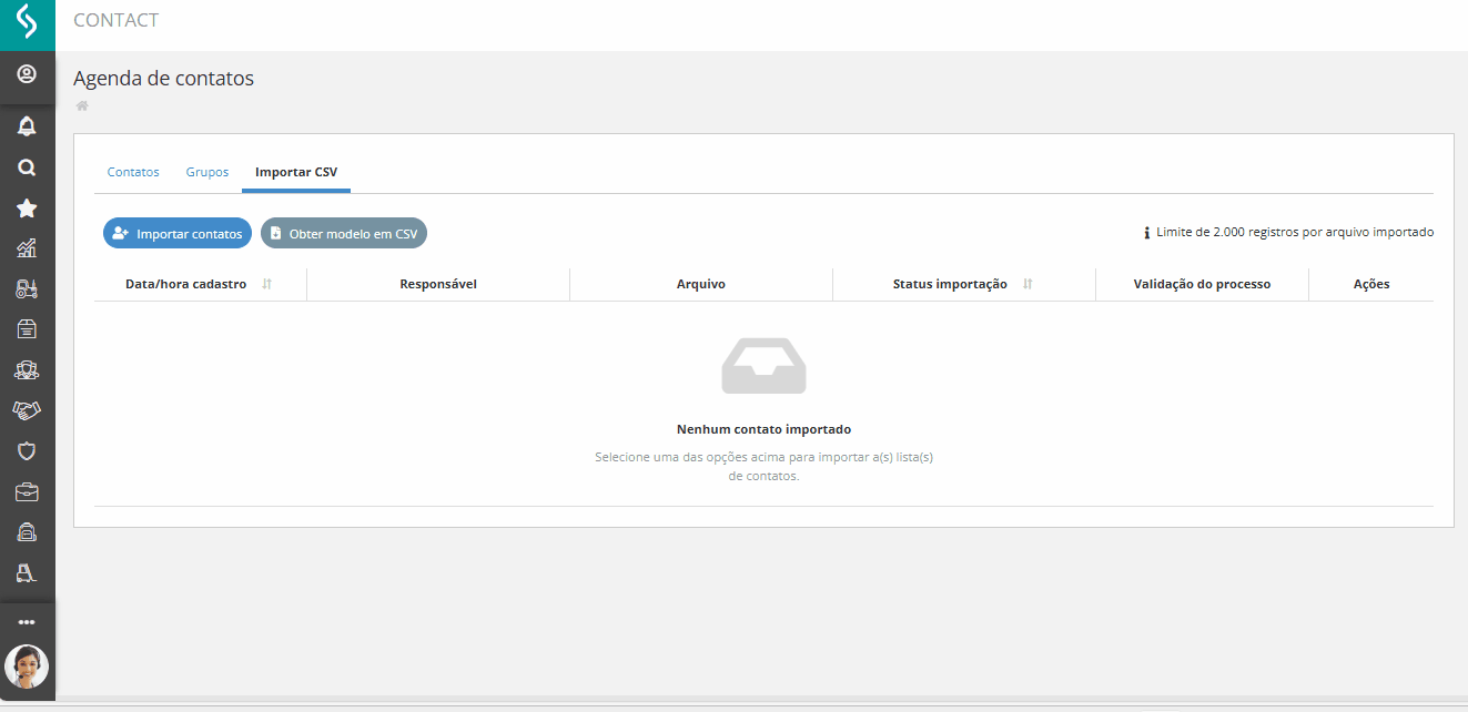 Opção que permite incluir vários contatos de uma vez, utilizando um arquivo CSV.