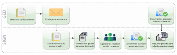 Por fim, com os documentos já assinados, cada documento recebe em suas páginas uma identificação de que este fora assinado, além de uma página adicional com a identificação dos assinantes, data do processo e o resumo original do arquivo.