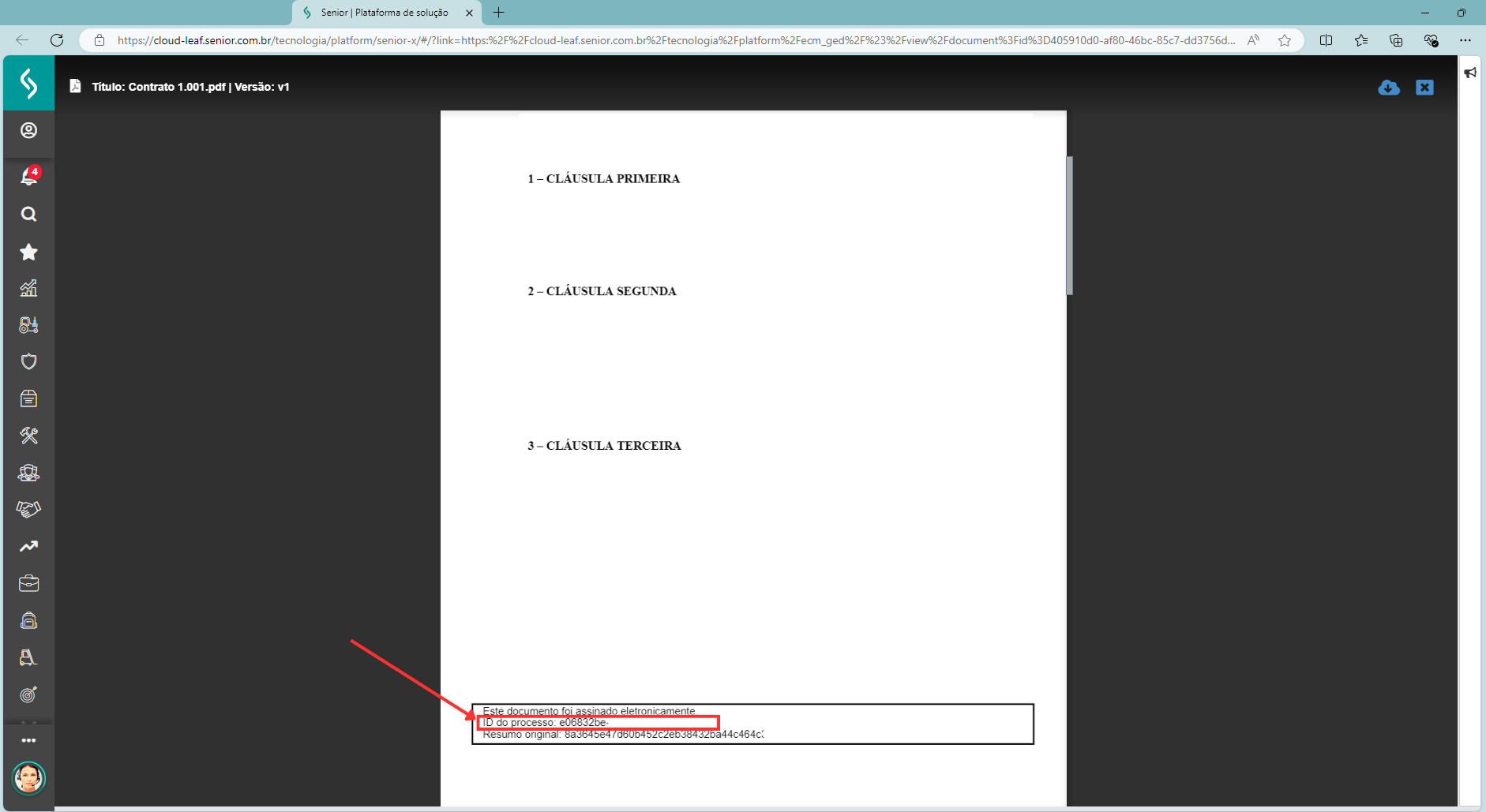 Abra o documento desejado. O ID do processo aparece no rodapé de cada página, dentro de um retângulo, ou na última página, no retângulo de resumo.