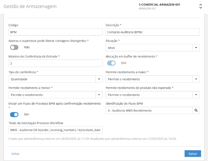 Com um Tipo de recebimento BPM cadastrado onde a opção Iniciar um fluxo de processo BPM após confirmação recebimento deve estar como Sim e a Identificação do Fluxo deste seja como Auditoria WMS Recebimento por exemplo. Veja: