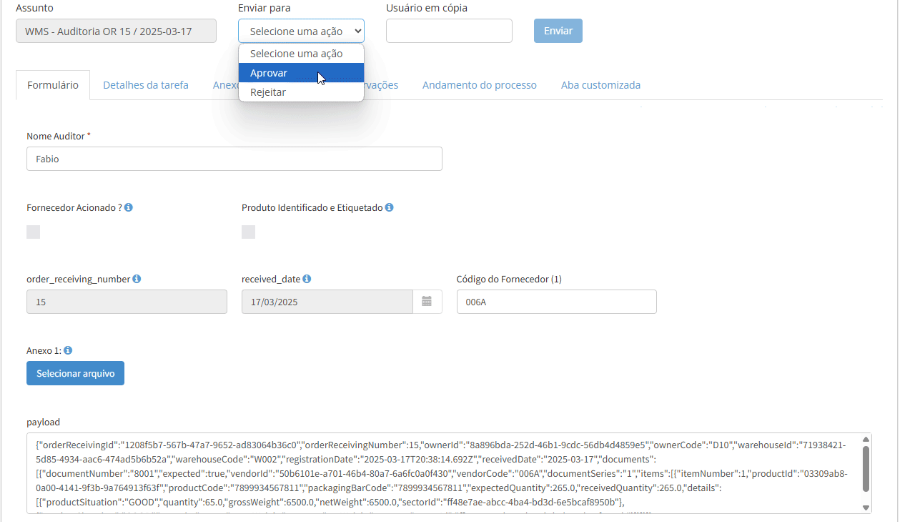 Quando o tipo de recebimento esta marcado como Iniciar um fluxo de processo BPM após confirmação recebimento como Sim em Gestão de Armazenagem |WMS X > Recebimento Tipo Recebimento, o título da solicitação pode ser configurado dinamicamente utilizando placeholders. Esses placeholders serão substituídos pelos valores correspondentes no momento da execução do processo.