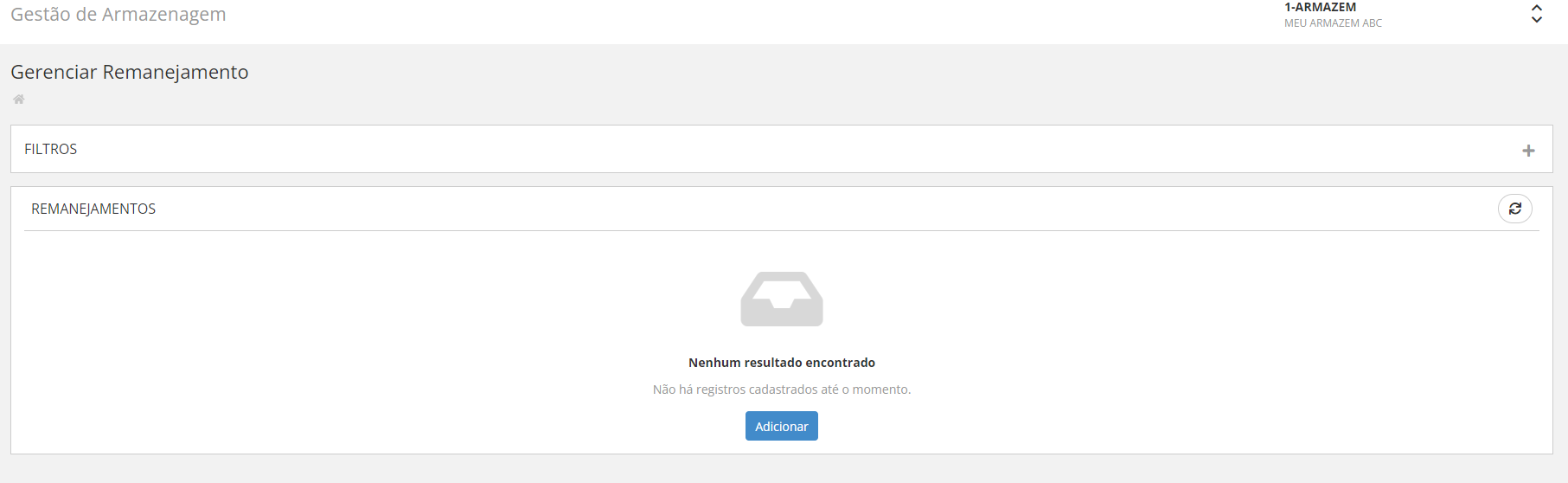 O remanejamento via tela, é realizado em Gestão de Armazenagem WMS X > Remanejamento > Remanejamento.