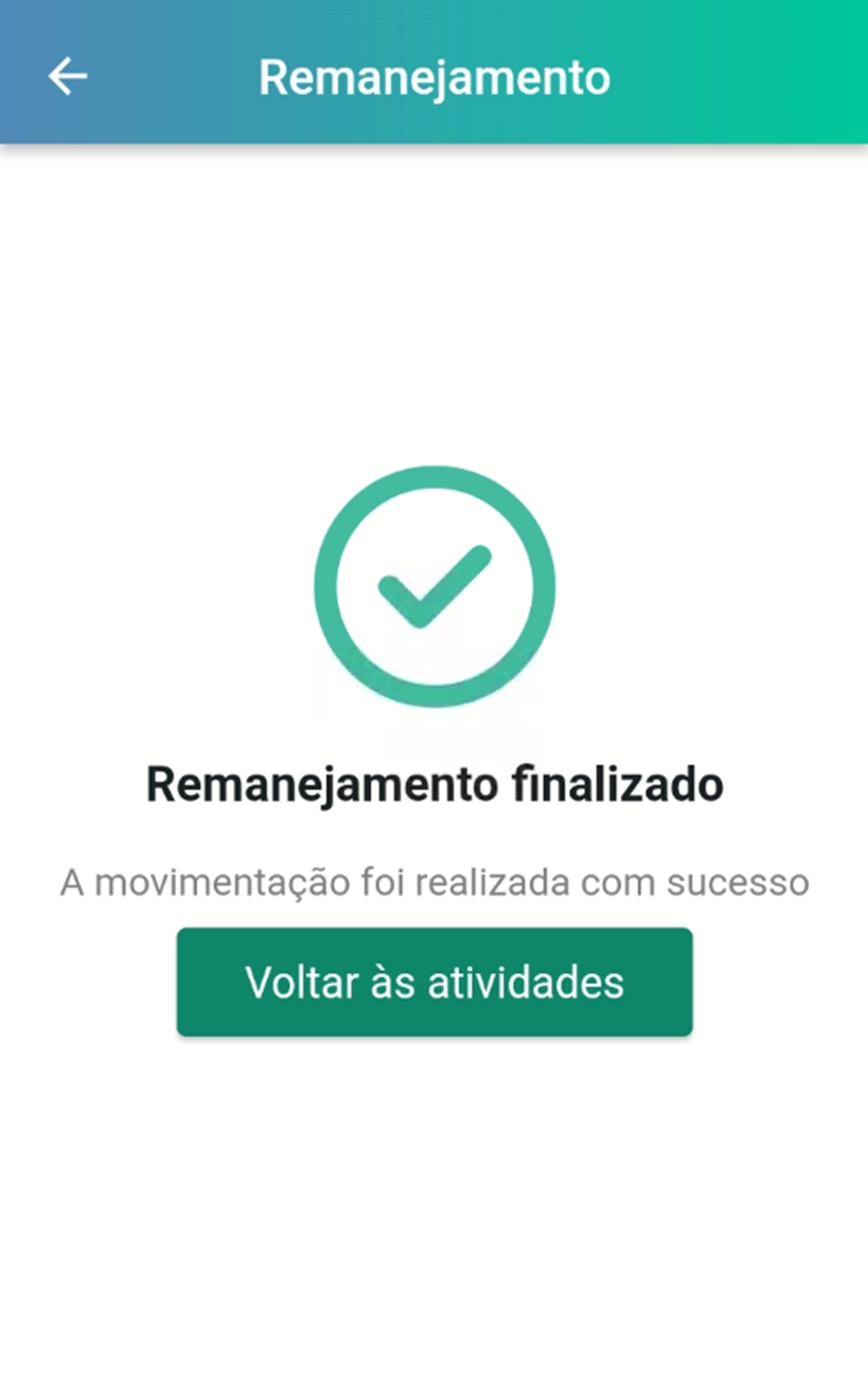 Ao finalizar uma das três movimentações acima, você pode clicar em Voltar as atividades, o sistema te direcionará para o endereço de origem. Se prevenir, pode conferir o status em tela do sistema: Gestão de Armazenagem WMS X > Remanejamento > Remanejamento.