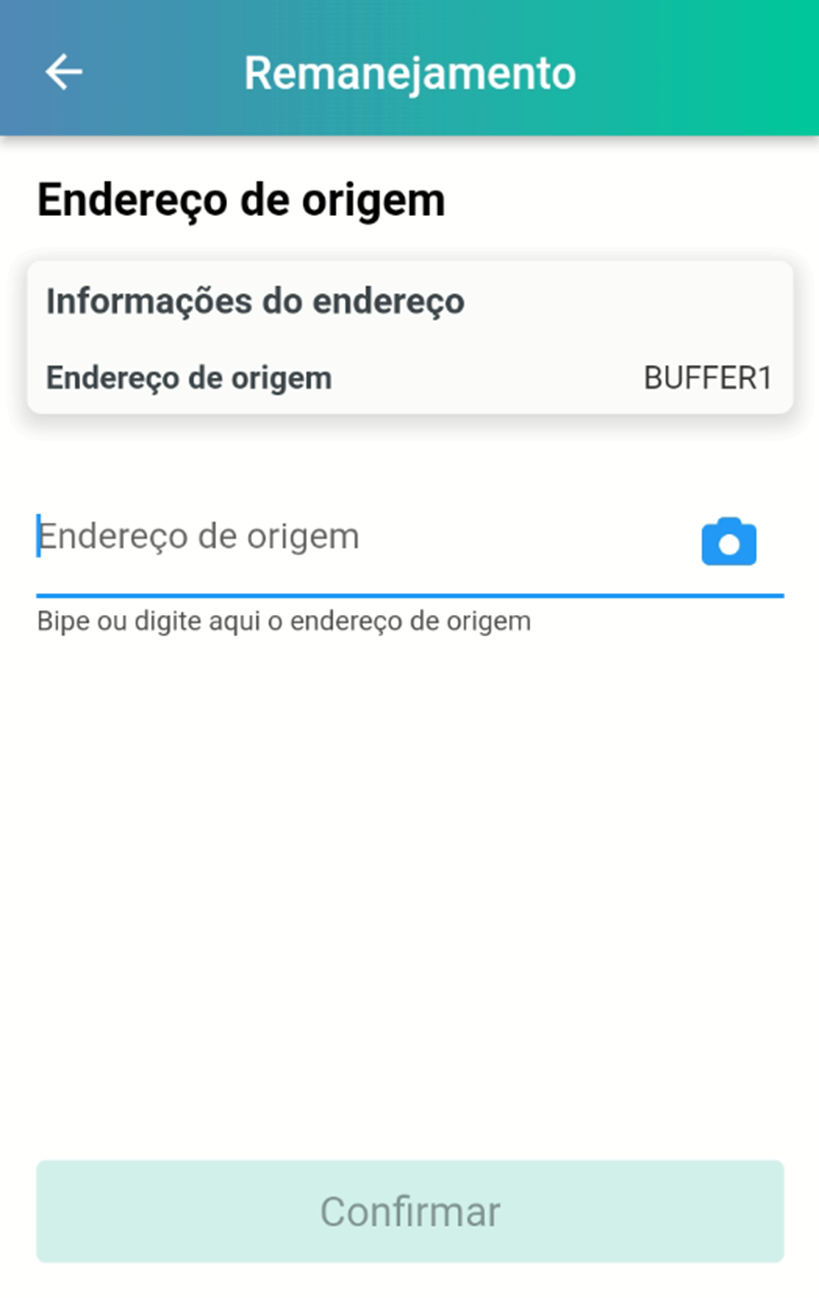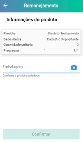 - Ao confirmar seguirá para a tela de resumo de movimentação, onde será possível confirmar ou caso tenha mais embalagens, permitir que o usuário adicione mais embalagens para remanejar, levando em consideração o local de origem informado;
