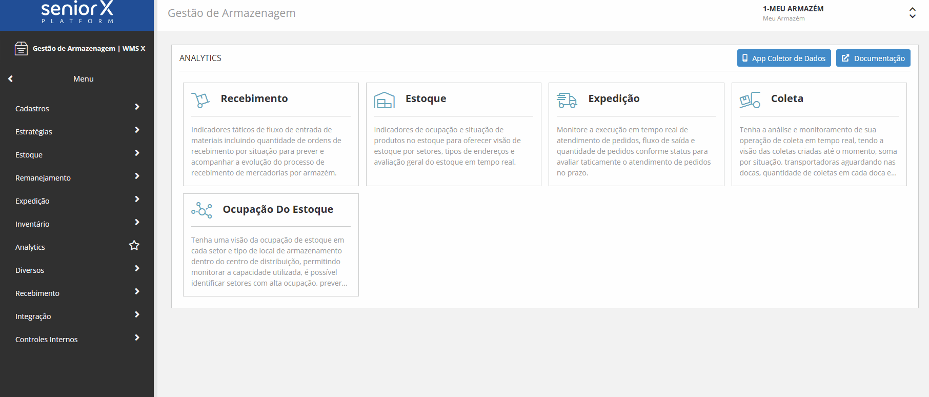 A tela de boas-vindas do Gestão de Armazenagem | WMS X é um Analytcs onde você terá um Dashboard para melhor visualizaçao de diversas funcionaldades como o Recedimento e Entrada e Saída de Mercadoria, por exemplo. Nesta tela no canto superior, você ainda pode acessar Portal de Documentação, que facilita o acesso ao manual por processo do WMS X e ao Notas da Versão da solução, onde é possível acompanhar todas as novidades implementadas no sistema. E ainda poderá realizar o download do aplicativo do coletor de dados, dispositivo imprescindível dentro de qualquer armazém e para o funcionamento do nosso sistema. Basta fazer a leitura do QR Code (código de barras bidimensional).