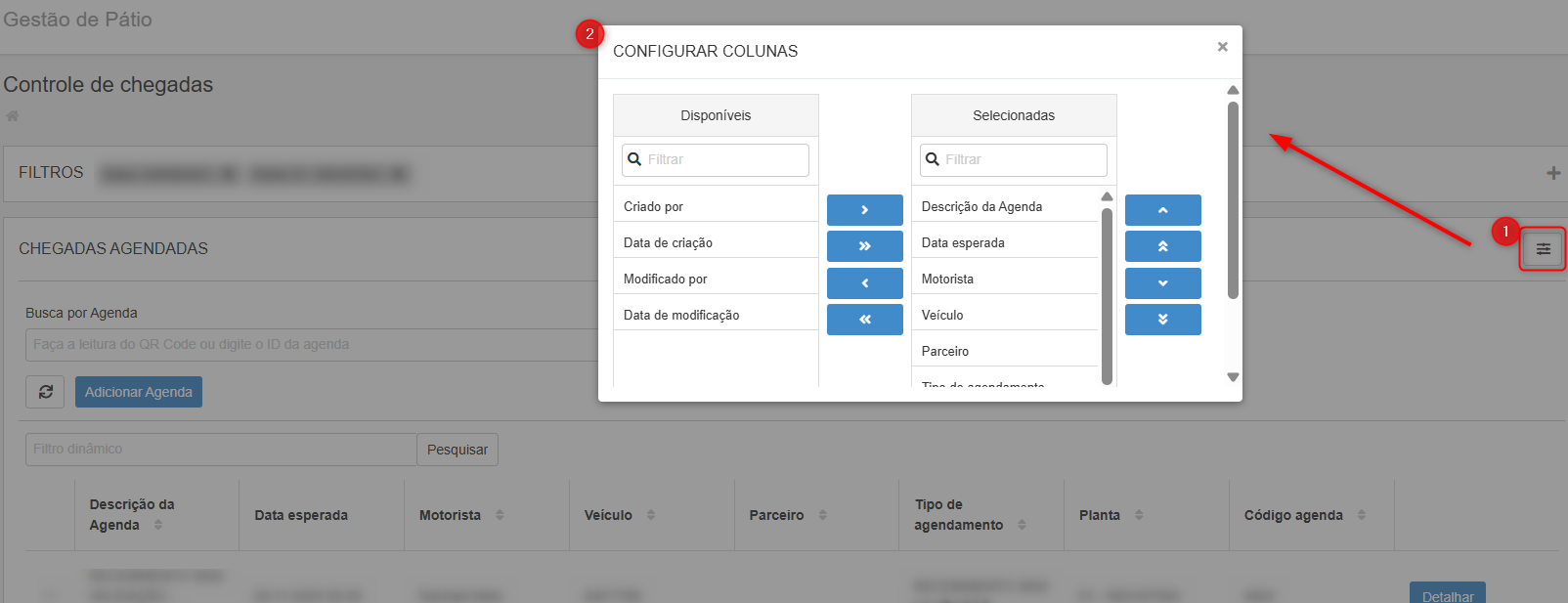 A tela de Controle de Chegada disponibiliza um recurso que permite definir quais informações serão apresentadas no painel de Chegadas Agendadas. Essa configuração abrange tanto a seleção dos campos quanto a organização da ordem em que aparecem.