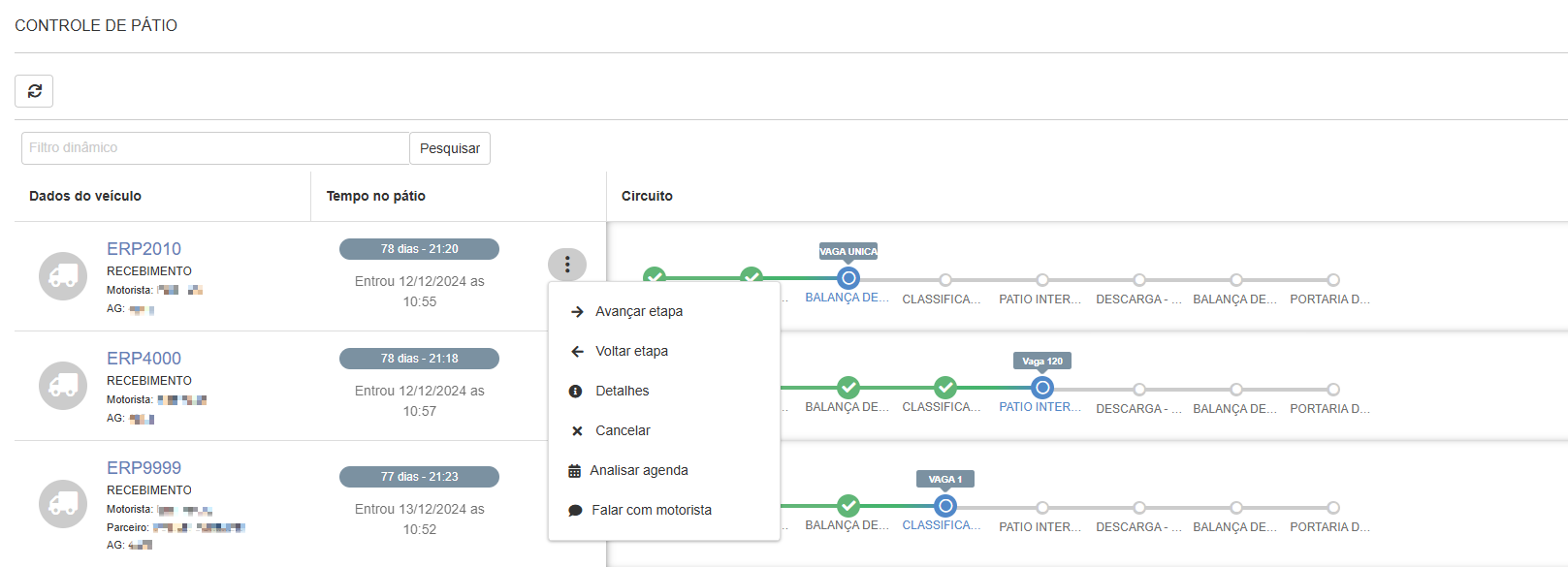 Os veículos movimentados no Controle de Circuito podem ser visualizados através de um Painel de Chamadas. Esse painel facilita o gerenciamento da área do pátio, proporcionando uma visão geral de todas as chamadas em andamento.