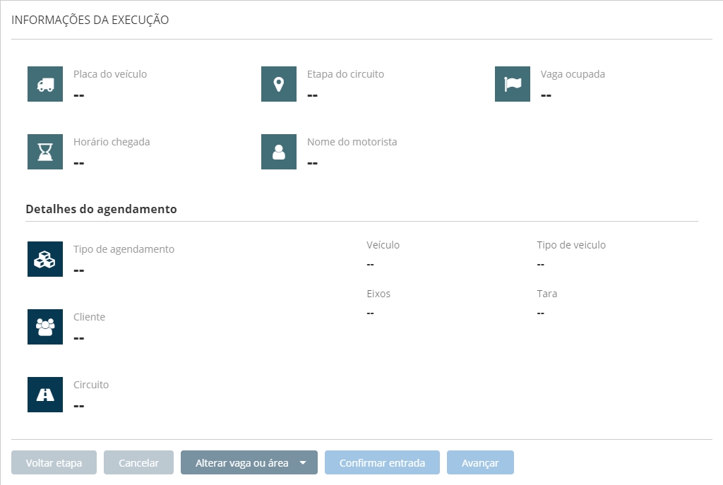Contém informações como, placa do veículo, etapa do circuito, vaga ocupada, horário de chegada, nome do motorista, informações do agendamento, cliente, circuito, dados do veículo, assim como informações sobre rotinas e gatilhos criado no circuito e sub-circuito