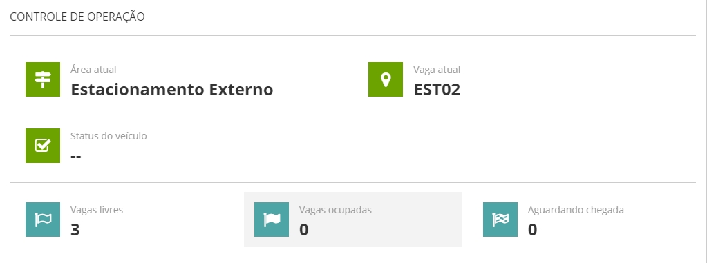 Apresenta as informações atuais de operação: área atual selecionada para a operação, vaga atual, status do veículo, assim como vagas livres, ocupadas e aguardando chegada.