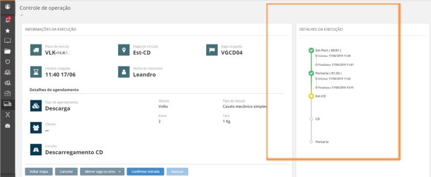 Na parte inferior da tela também existem as opções dos botões Voltar etapa, Cancelar, Alterar vaga ou área, Confirmar entrada e Avançar que podem ser rapidamente realizadas.