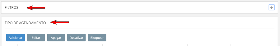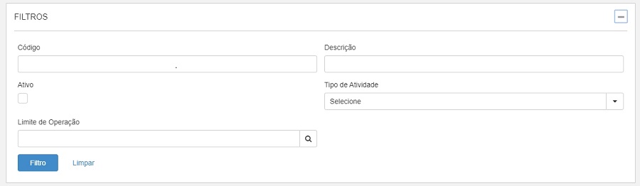 Por meio de filtros é possivel selecionar registros cadastrados baseado em algum critério, como código e tipo de atividade, por exemplo.
