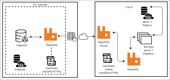 O modelo híbrido é um pouco mais complexo, pois exige a integração entre a rede da Cloud e On-Premise, ou seja, envolve a configuração de links seguros, além de componentes da Senior X tanto na Cloud quanto On-Premise para dar sustentação aos serviços de negócio que estão espalhados em ambos os modelos.