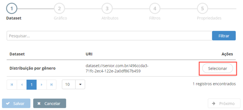 Abaixo das informações iniciais do widget, selecione o dataset que será usado para dar origem ao gráfico do widget.
