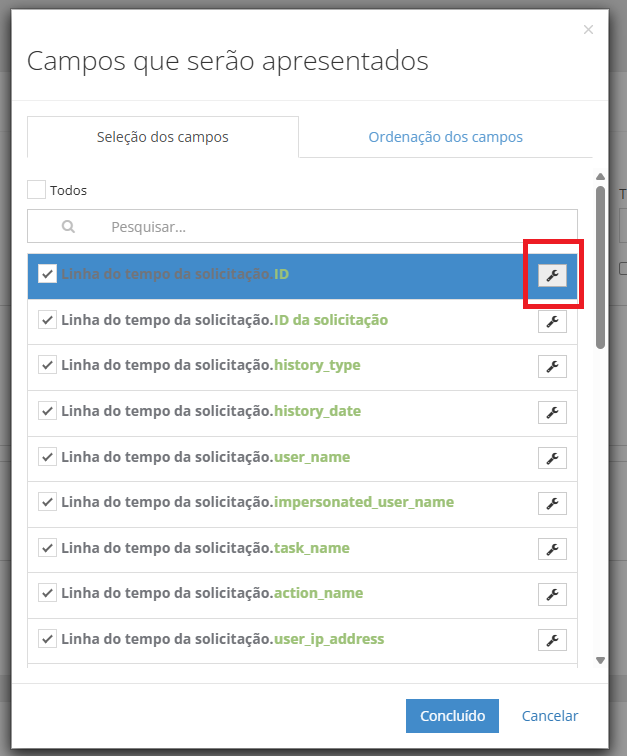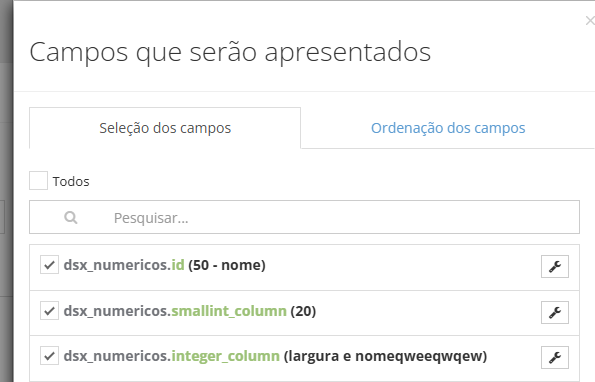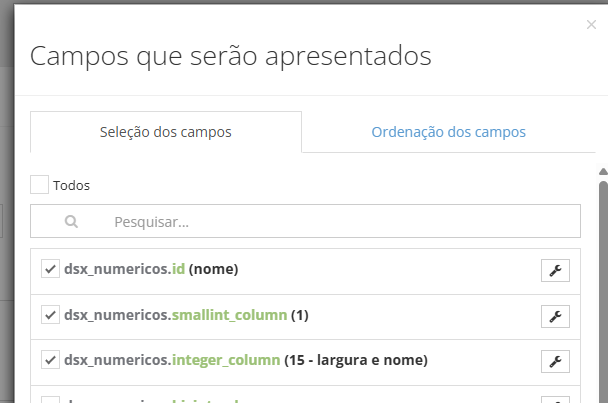 - Clique em Todos para abrir uma janela com todos os campos disponíveis para a tabela selecionada;