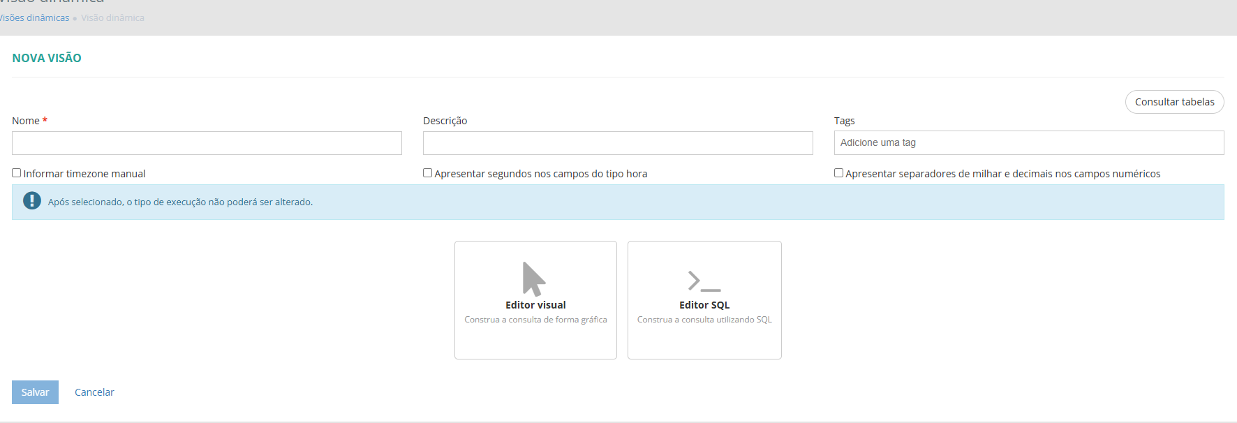 - Informe o Nome, Descrição e Tags para a identificação dessa visão dinâmica e clique em Editor visual para configurações;