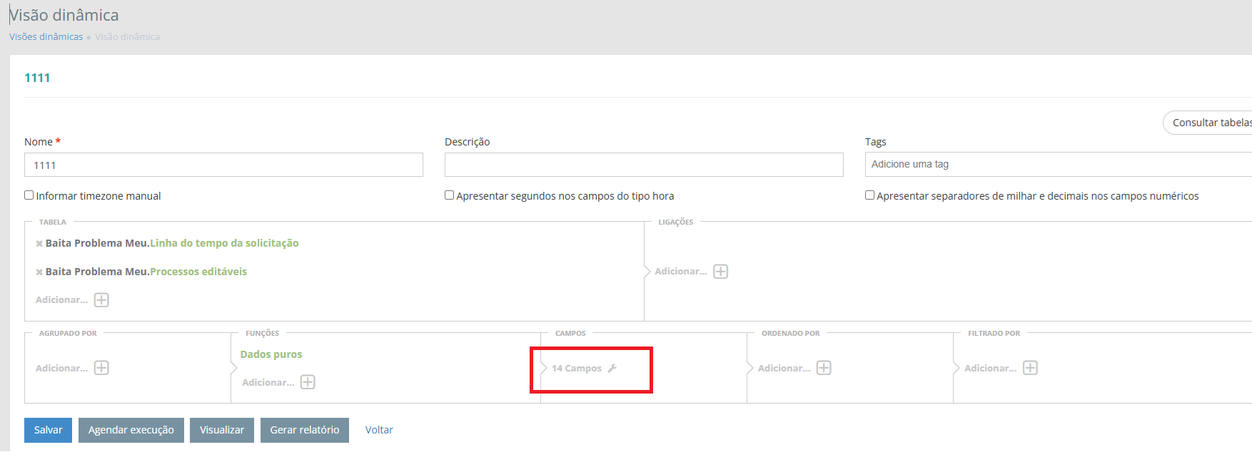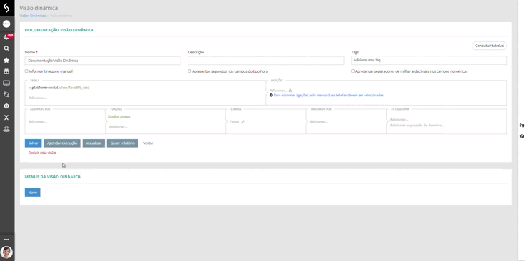 Após a criação de uma visão dinâmica, estão disponíveis todas as informações disponíveis na tabela selecionada. Porém, é possível escolher quais informações são exibidas e mudar a forma como elas são apresentadas, a partir dos recursos de agrupar, adicionar funções, esconder, mudar posição, ordenar e filtrar os campos da tabela, exceto em campos customizados: