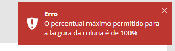 É importante destacar que a largura máxima permitida em um campo é de 100%. Caso o valor dos campos ultrapasse esse limite, o sistema impedirá a ação de salvar ou visualizar, exibindo uma mensagem de alerta.