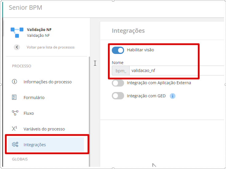 - Habilite o campo "Habilitar visão" e inclua um nome para a visão dinâmica deste processo;