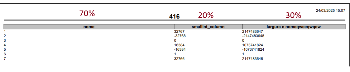 Opcionalmente, utilize o botão Visualizar para ter uma prévia das informações na tela (a visualização mostra até 10 linhas de dados) ou em Visualizar em PDF para ter uma noção da aparência dos dados em um arquivo PDF. Ao clicar em Visualizar em PDF, uma caixa de diálogo será exibida para definir a largura da exibição, útil principalmente para consultas com muitas colunas, pois ajusta os dados horizontalmente no arquivo.