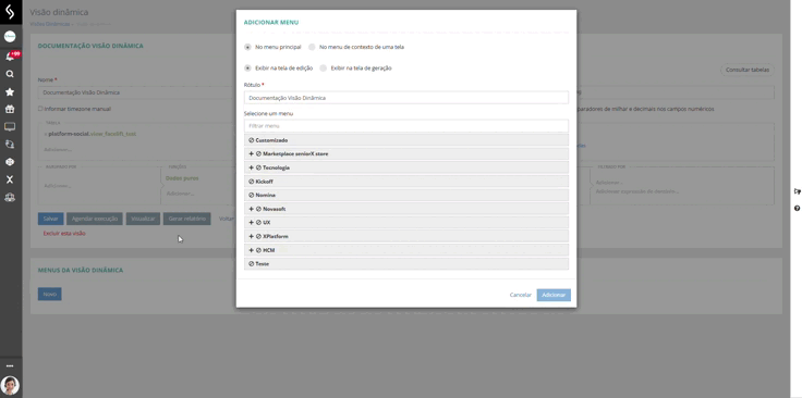 - Acesse o menu Tecnologia > Customização > Relatórios > Visão Dinâmica;