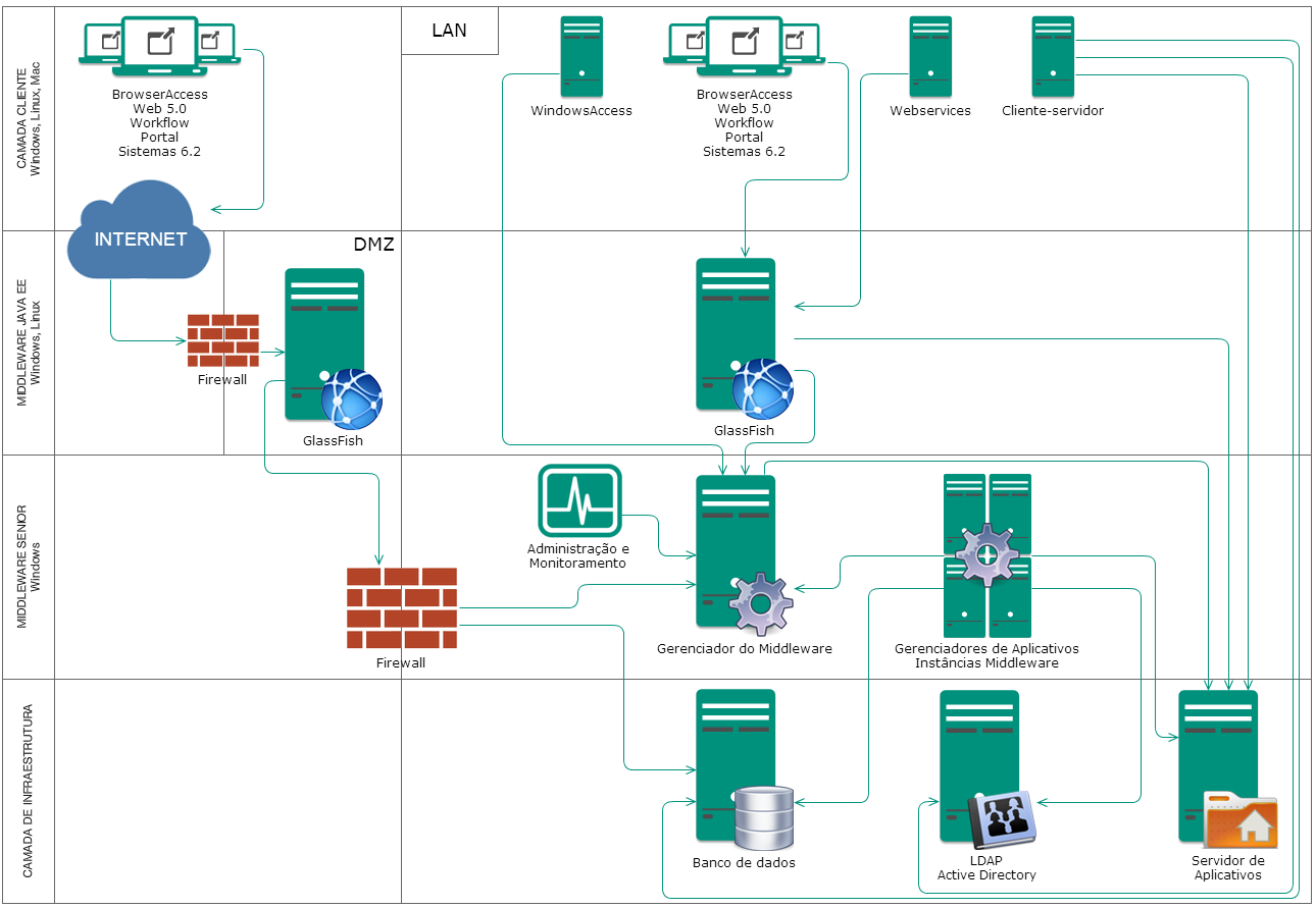 Camada indispensável para o funcionamento das formas de acesso BrowserAccess, Web 5.0, WindowsAccess e web services. Essa camada abriga os componentes centralizadores da solução Senior, responsáveis pelo gerenciamento, configuração e monitoramento de todos os aplicativos utilizados.