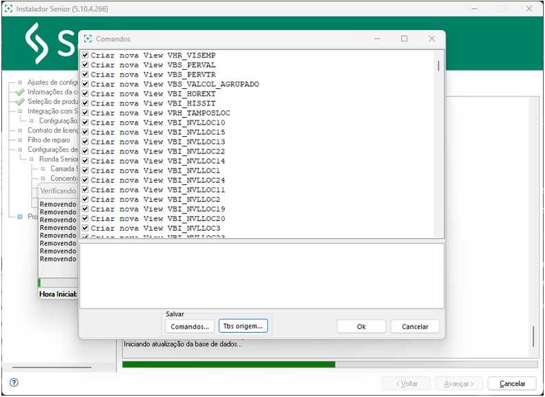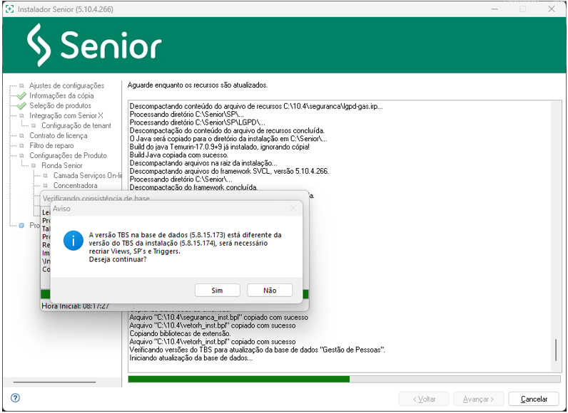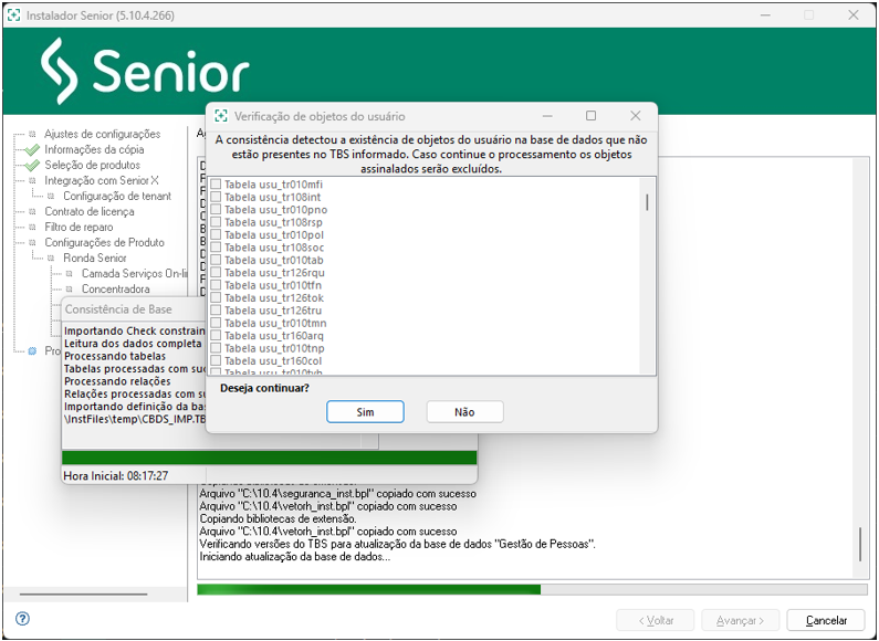 - Caso existam objetos que não estão devidamente cadastrados no TBS, será apresentada uma caixa de verificação informando-os. É necessário avaliar se possuem scripts de inicialização e finalização para garantir que estejam corretos no banco. Após essa verificação, clique em Sim para seguir;