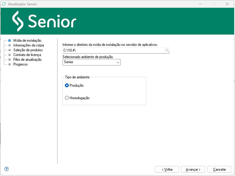 - Selecione o ambiente que será alterado: selecione o ambiente que deve ser atualizado. Nesse local é apresentada uma lista com o nome de todos os ambientes existentes no diretório de instalação. Caso exista somente um, apenas ele será apresentado;