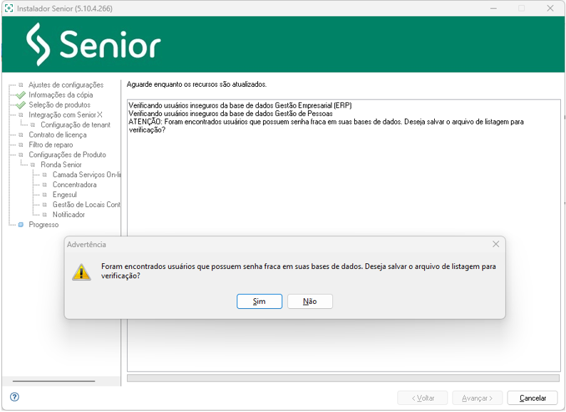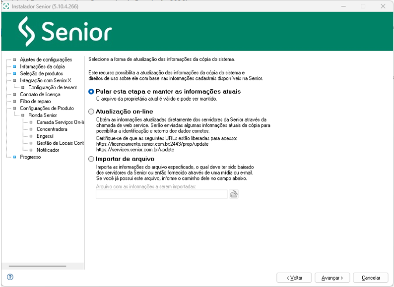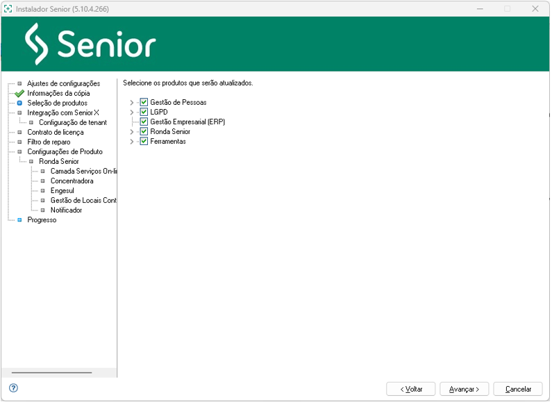 - Selecione os produtos que vão ser atualizados. O recomendado é atualizar todo o sistema Senior. Em seguida, clique em Avançar;