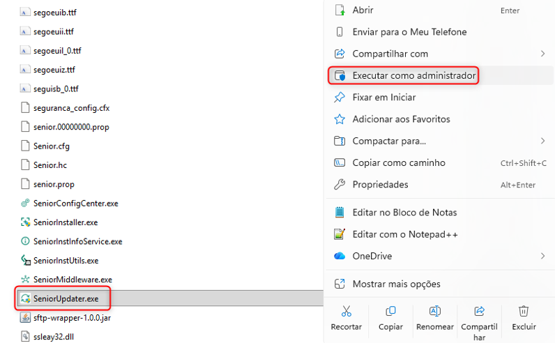 - Localize o arquivo SeniorUpdater.exe e, com o botão direito do mouse, clique em Executar como administrador;