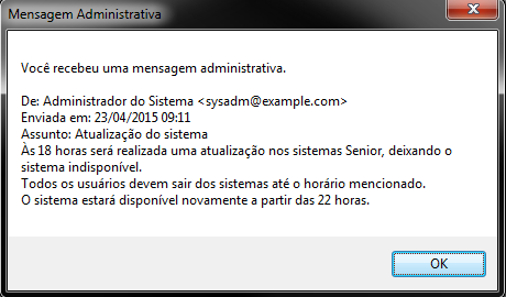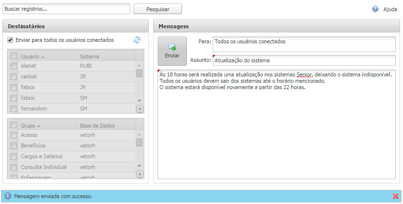 A central de monitoramento permite o envio de mensagens administrativas para os usuário que estiverem conectados nos sistemas. As mensagens podem ser enviadas para qualquer usuário que esteja utilizando sistemas da tecnologia 6.2 (Java) em acesso cliente-servidor, BrowserAccess e/ou WindowsAccess.