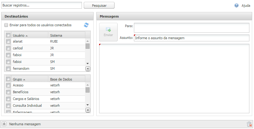 Exibe todos os grupos de usuários existentes nas bases de dados do ambiente, considerando os filtros definidos na Central de Configurações > Mensagens Administrativas. Ao enviar uma mensagem para um grupo, ela será exibida para todos os usuários participantes que estiverem utilizando o sistema no momento do envio da mensagem.