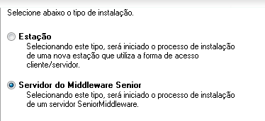 Acesse o compartilhamento do diretório raiz, criado no primeiro passo da instalação, e execute o arquivo SeniorInstaller.exe Depois da tela de Boas Vindas, selecione a opção Servidor SeniorMiddleware e clique no botão Avançar.