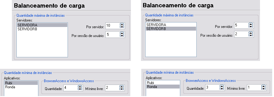 Abaixo segue um exemplo do balanceamento de carga em dois servidores (A e B), para os aplicativos Administração de Pessoal e Controle de Ponto e Refeitório do Gestão de Pessoas, considerando que eles são acessados através do BrowserAccess e do WindowsAccess.