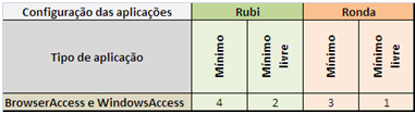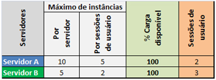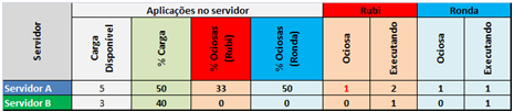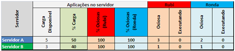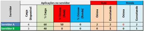 | Assim que o gerenciador do Middleware for iniciado ele vai inicializar as quantidades mínimas do Administração de Pessoal e do Controle de Ponto e Refeitório, distribuindo as aplicações nos servidores A e B conforme demonstra a tabela abaixo. | |