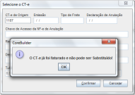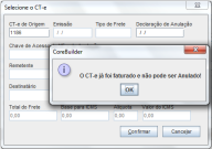 Para emissão de CT-e de Anulação, o documento substituído não pode ter sido faturado. Neste caso, ao tentar emiti-lo, o sistema trará a mensagem abaixo: