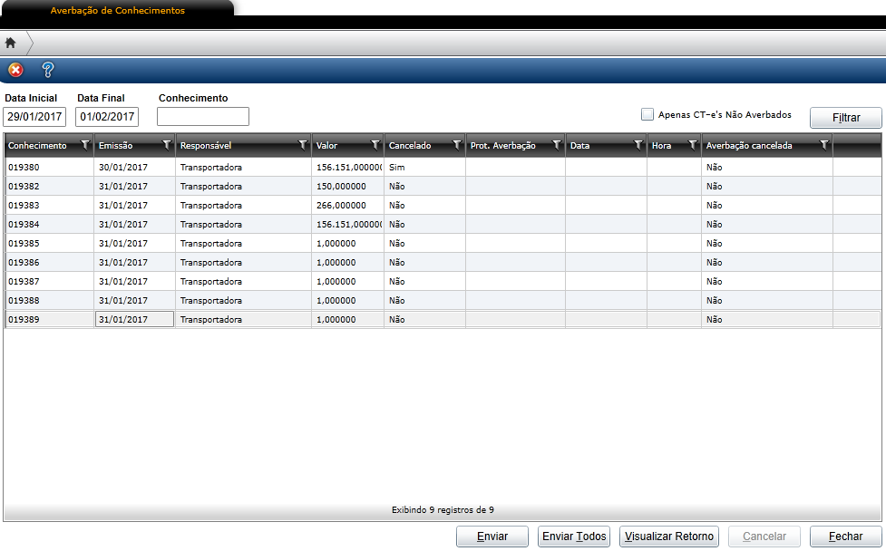 Esta tela viabiliza o envio do CT-e para a seguradora responsável pelo seguro da mercadoria objeto do frete. Em Operacional > Expedição > Conhecimento de Frete > Averbação de CT-e