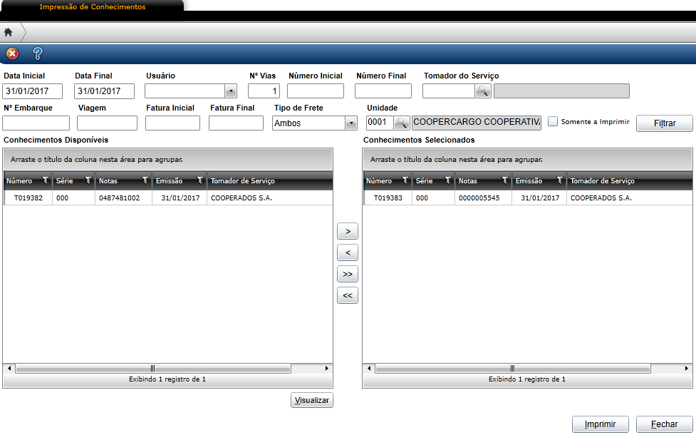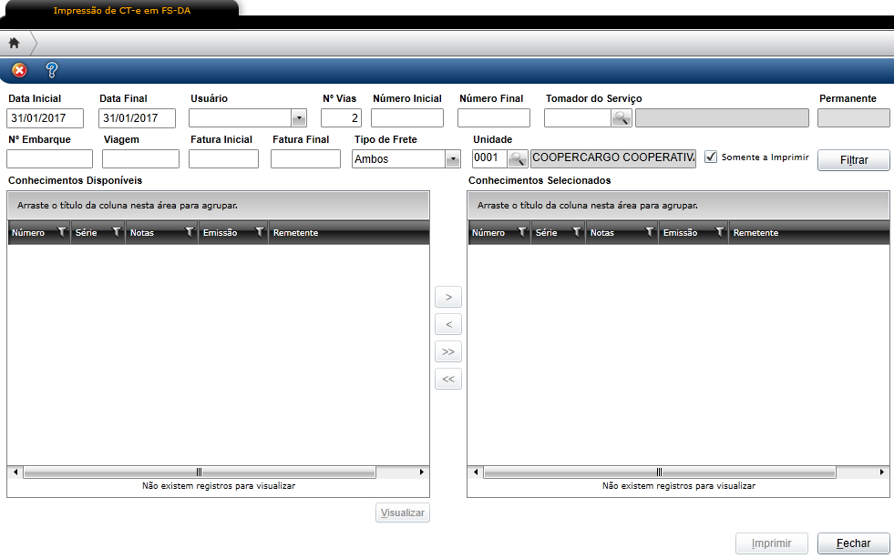 Para realizar a impressão, basta escolher os filtros necessários e selecionar os CT-e’s na grid [Conhecimentos Disponíveis], movê-las para a grid [Conhecimentos Selecionados] e acionar o botão [Imprimir].
