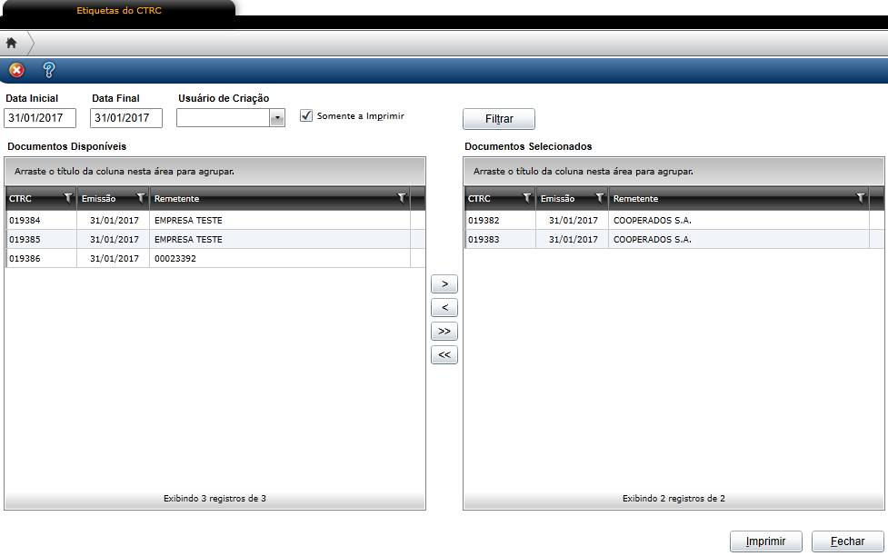 Para realizar a impressão de etiquetas, basta escolher os filtros necessários e selecionar os CTF-e’s na grid [Documentos Disponíveis], movê-las para a grid [Documentos Selecionados] e acionar o botão [Imprimir].