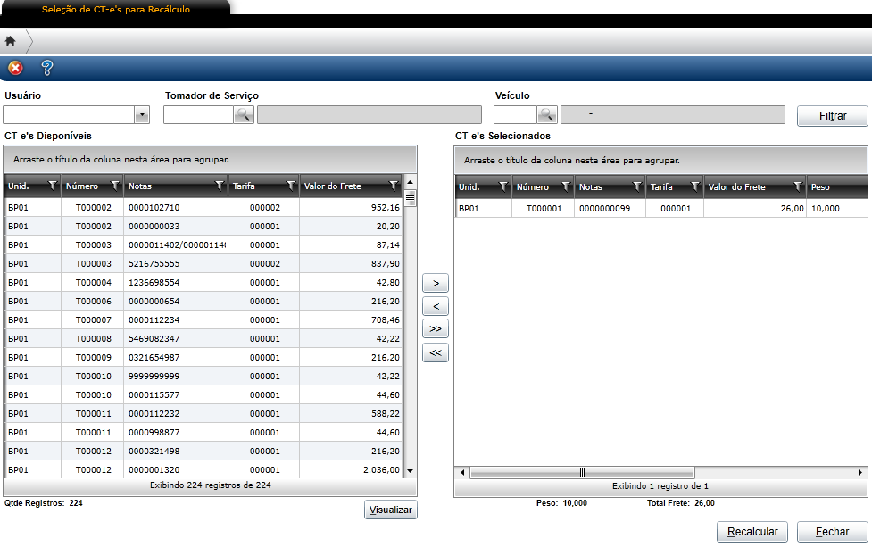 A tela [Seleção de CT-e’s para Recálculo] tem a função de recalcular o frete que será cobrado, evitando abrir o CT-e para isso. Em Operacional > Expedição > Conhecimento de Frete > Recálculo, deve-se aplicar os filtros necessários para listar os conhecimentos a serem recalculados, selecioná-los na grid [CT-e’s Disponíveis] e movê-los para a grid [CT-e’s Selecionados].